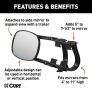 The CURT extended view tow mirror does just what its name suggests: it extends your view when towing. Quickly mounting on your side mirror, the tow mirror instantly adds five to seven and a half inches to your mirror, opening up your view behind your vehicle and minimizing blind spots. Also, because the tow mirror is fully adjustable, it does not merely make your side mirror larger, but it pivots, angles and rotates to give you the perfect view you need to see around that extra-large load and safely tow to your destination. The CURT tow mirror is extremely versatile, being able to mount onto any mirror between 4" and 11" tall. This makes it a useful extension for most vans, trucks and SUVs as well as other vehicles if needed. Because of the extended view tow mirror's versatile design and fully articulating head, it can be used on either the driver side or passenger side, whichever is more useful for your towing setup. It can also be positioned vertically or horizontally. For added visibility and safety while towing, the CURT extended view tow mirror is a lifesaver.