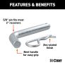 When you mount a ball mount on your trailer hitch, you expect it to stay put. Whatever type of load you are hauling, having towing equipment that can work as hard as you do is a must. For all types of heavy-duty towing, CURT 5/8" hitch pins and clips pack a little extra punch. We make our 5/8" hitch pins out of solid steel and coat them in one of four finish options. All of these finishes offer excellent resistance to rust and corrosion for long-lasting, smooth operation. CURT hitch pins are also constructed with a 105-degree bend, creating a useful handle for a better grip and allowing the pin to stay securely engaged in the trailer hitch and ball mount. This particular 5/8" hitch pin features a zinc finish and comes with a standard retainer hole to accept the included clip. It provides reliable installation for any ball mount or hitch-mounted accessory with a 2" shank, making it the perfect fit for class 3, 4 and 5 trailer hitches.