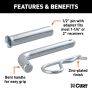 The job of a hitch pin is incredibly important in towing, and for this reason, CURT hitch pins and clips are made to be of the utmost quality, providing you with reliable security for your trailer and cargo. CURT 1/2" hitch pins measure a full half inch in diameter and are constructed from solid steel. This helps ensure they have the strength they need to serve your towing needs. Our 1/2" pins are available in a number of finishes to give you options for your specific vehicle and trailer hitch. This 1/2" hitch pin features an adapter sleeve that allows it to be used in either a 1/2" or 5/8" hole. It provides reliable installation for any ball mount or hitch-mounted accessory with a 1-1/4" or 2" shank. It also comes with a zinc finish and a standard retainer hole to accept the included clip. All CURT 1/2" pins come with a 105-degree bend, making them easier to handle and operate when mounting your ball mount.