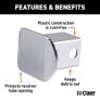 If you own a vehicle with a trailer hitch, you know how quickly the receiver tube can get built up with dirt, debris and road grime. It does not take long before inserting a ball mount or hitch-mounted accessory into your trailer hitch becomes more difficult than it should ever have to be. With enough time and moisture exposure, the inside of a receiver tube can become seized up with rust, making it very difficult to use. Keep your trailer hitch's receiver tube clean and protected when not towing with one of CURT's attractive and durable tube covers. This CURT 2" x 2" receiver tube cover is constructed from plastic and features a bright chrome finish. It is designed to mount onto a receiver tube opening using a hitch pin and clip. At CURT, we want to give you a complete towing solution and that includes providing you with the products necessary to maintain your towing equipment. Defend your trailer hitch from the harsh elements with a CURT trailer hitch cover.