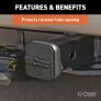 If you own a vehicle with a trailer hitch, you know how quickly the receiver tube can get built up with dirt, debris and road grime. It does not take long before inserting a ball mount or hitch-mounted accessory into your trailer hitch becomes more difficult than it should ever have to be. With enough time and moisture exposure, the inside of a receiver tube can become seized up with rust, making it very difficult to use. Keep your trailer hitch's receiver tube clean and protected when not towing with one of CURT's attractive and durable tube covers. This CURT 1-1/4" x 1-1/4" receiver tube cover is constructed from quality rubber and mounts on your trailer hitch with a friction fit, meaning no hitch pin or clip is required. At CURT, we want to give you a complete towing solution and that includes providing you with the products necessary to maintain your towing equipment. Defend your trailer hitch from the harsh elements with a CURT trailer hitch cover.