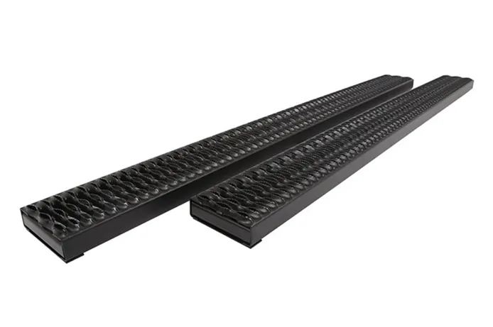 Dee Zee Rough Step - Industrial gauge steel coated in Dee Zees black NRT(TM) (No Rust Technology) powder coat to increase corrosion resistance. Industrial grating step provides extra traction getting in and out of the vehicle while allowing mud, water, snow, and ice to drain off the stepping area. Full length. Custom Fit - some drilling may be required. Brackets sold separately.