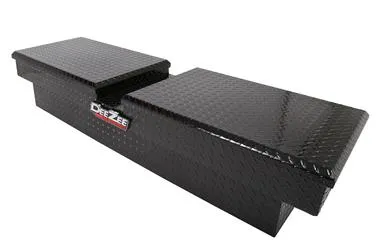 Dee Zee Tool Box - Red Label Double Lid (Gull Wing) Crossover. Constructed of heavy duty Brite-Tread aluminum. Black-Tread powder coat, provides a gloss black finish while it protects and prevents oxidation. Crown style lid for superior rigidity. Other features: lockable stainless steel paddle handles, dampened gas shocks, closed cell foam gasket, and self-adjusting strikers. Removable plastic tool tray to help keep small items organized.