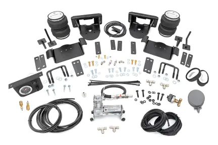 Ideal Leveling: Is your truck your workhorse? The main attraction of a pickup is the ability to haul and tow as needed. However, due to the weight in the bed or the condition of the rear leaf springs, your vehicle may become un-level under load. At Rough Country, we've designed a solution to eliminate these concerns. Introducing Rough Country's Rear Air Spring Kit. Heavy-Duty Construction: Rough Country's Rear Air Spring Kit includes two high-quality, double convoluted air bags, reinforced with durable powder-coated steel brackets and DOT-approved airlines. Whether you're towing a trailer or hauling heavy loads, this kit helps ensure your vehicle remains level, alleviating the strain on your trailer's tongue weight. The kit features 1/4" push-to-connect air fittings for easy installation, along with all necessary bracketry for a secure fit. Rough Country's Air Spring Kit supports up to 5,000 lbs. of load, minimizing sway and preventing bottoming out while braking and steering. Easy Installation: Quick and simple setup for immediate use. Rough Country's kit can be installed at home with standard tools in just 5-6 hours, ensuring minimal downtime and fast, hassle-free installation. Onboard Air Compressor and Wireless Controller: For added convenience, Rough Country offers an optional onboard air compressor and wireless controller to easily adjust your air spring kit on the go. Control air pressure at the push of a button from the comfort of your vehicle. Reliable Warranty Coverage: Rough Country's Rear Air Spring Kit includes a limited lifetime warranty on the air springs and a two-year replacement warranty on the compressor, offering lasting protection against manufacturer defects. This industry-leading coverage ensures confidence in both quality and durability, so you can count on Rough Country to keep your truck performing at its best.