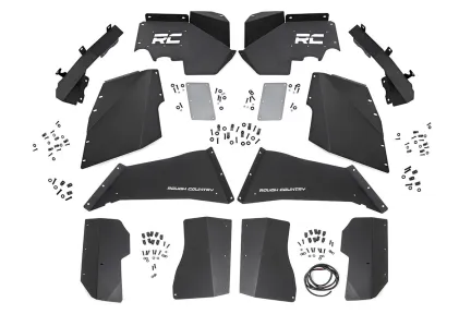 Clean up the look of your inner fenders when using aftermarket flares with Rough Country's JK Front and Rear Inner Fender Liners. These eye-catching inner fender upgrades help protect sensitive areas from dust, mud, and debris, and can be easily installed in no-time flat! Aftermarket fenders are a huge improvement for most Jeeps wanting to get the best clearance and articulation possible, but when removing the stock fenders many people also remove the stock fender liners. Regain protection in this crucial area and protect your engine bay from the elements with Rough Country's innovative Front and Rear Inner Fender Liners. With a unique 3-piece construction, these liners cover more areas than other liners on the market, giving more protection to your engine bay and body panels. Each Rough Country liner features a corrosion-resistant powder coat for long-lasting durability. Additionally, these liners mount firmly to the body for quiet operation, free of rattling or vibration noise. The solid-steel, angular design with "RC" and GRough Country" logo cutouts gives an aggressive look to this now more visible area on your JK. An included, removable logo plate for the front liner can be custom painted to any color you wish for a pop of extra color, while the rear liner lines up perfectly to show the painted body color behind it. Rough Country Inner Fender Liners feature a bolt-on installation process with minor drilling for an easy upgrade you can do with common tools in a home garage. Includes Rough Country's Lifetime Replacement Warranty.