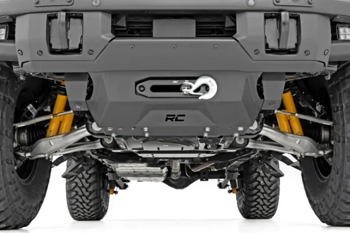 Superior Function and Looks. Who says you can't have a great-looking Bronco that also can conquer any task at hand. Here at Rough Country, we are providing jaw-dropping good looks and functionality with Rough Country's Hidden Winch Bumper for the all-new Ford Bronco! Durability and protection. Rough Country's Hidden Winch Bumper provides the best of both worlds offering a stylish new approach for equipping a recovery system to your vehicle. Featuring a standard 4.5in X 10in 4 bolt Winch Mount, our hidden winch bumper can fit most standard size winches up to 12,000 lbs. and does NOT impede airflow to the intercooler. Boasting a massive 11 gauge thick powder-coated skid plate rest easy knowing that your Bronco's underbelly is well protected for any terrain. Installation. With a minor cutting required to install an estimated timeframe of 3-4 hours this full kit can be installed at home using standard tools and can be completed efficiently and quickly! Lifetime Replacement Warranty. Rough Country's Hidden Winch Bumper is backed with a lifetime replacement warranty towards manufacturer defects. As such, the product is protected from structural and workmanship damage after the date of purchase. With our industry-leading warranty give yourself peace of mind when using Rough Country's Suspension products!