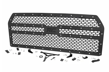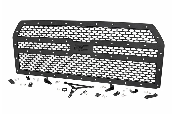 Give the front-end of your Ford F-150 a unique look with Rough Country's Mesh Grille kit! This easy to install grille replacement kit swaps out your stock grille with the eye-catching, head-turning good looks of this aftermarket upgrade. With a unique, laser-cut mesh pattern surrounded by stylish, stainless steel rivets, this grill gives your truck a more menacing look that s sure to draw attention. This easy-to-install grille requires no cutting or drilling and can be returned to stock at any time. Each kit is powdercoated black to resist corrosion and give a long lifespan of good looks. This kit also allows you to retain your active grille shutter system and front camera and features Rough Country's Lifetime Replacement Warranty!