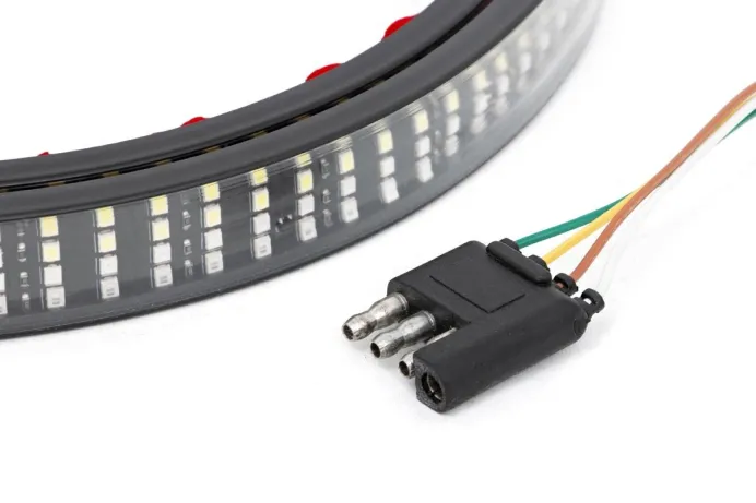 Enhance the rear of your truck with Rough Country's Quad-Row Multifunction LED Tailgate Light Strip. This easy-to-install LED strip is both practical and enjoyable, with multiple lighting functions that enhance daily driving while dressing up the rear of your truck. Rough Country's Multifunction LED Tailgate Light Strips offer multiple modes that accentuate different driving scenarios. With a series of red and white LED s all tied into the same strip, this tailgate upgrade offers bright red brake lights, dim red running lights, white reverse lights, and half-panel turn signal lights. These Multifunction LED Tailgate Light Strips are easy to install, with a plug-and-play 4 pin adapter that connects easily and effortlessly to your Truck's trailer connector for immediate use. The LED strip itself adheres with a set of pre-included 3M automotive-grade adhesive pads that go on fast and stay put. These handy tailgate LED Lights install into the recess between the tailgate and the bumper. Each Multi-Function Tailgate LED strip features an IP68 Waterproof design, guaranteed to resist dust and even prolonged water immersion. Includes Rough Country's 3-year limited Warranty.