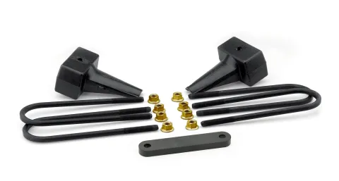 ReadyLIFT OEM-style rear block kits are available for 2011-2016 Ford Super Duty model specific applications. These new 5.0" Rear Block Kits include two (2) Rear Blocks, four (4) 16.5" Long E-Coated U-Bolts, eight (8) Nuts and Washers and one (1) Carrier Bearing Spacer. Based on OEM designs and never made out of light weight extrusions our 5" 2011-2016 Ford F250/F350 Super Duty Blocks have Integrated OEM Style Bump Stops. ReadyLIFT Block Kits will put a slight rake back in your truck for hauling or towing and are designed to work with your ReadyLIFT Suspension Leveling Kit. In fact, these blocks are the ideal Tow Package upgrade for not only for stock height vehicles but lifted or leveled trucks too! Like all ReadyLIFT products, these block kits come with our Limited Lifetime Warranty. Note: 66-2015 5" block is for use on 2011-2016 Ford F250 / F350 Super Duty 2WD/4WD trucks with 2-piece drive shaft. Lift height will vary depending on what factory block your truck has. Note: Fits Single Rear Wheel Trucks ONLY -- Not Dual Rear Wheel Configurations NOTE: The lift blocks in this kit are not designed to work with aftermarket or factory add-on air spring/load leveling kits that attach to the bump stop tangs. Use of this type of air bag system will void all block warranties and can cause failure of the block bump stop tang.
