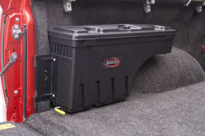 SwingCase by UnderCover is the most innovative and versatile truck storage box ever made. Built to last from lightweight, high-impact ABS plastic; the tough, weatherproof, SwingCase is custom fitted for your truck. The SwingCase is affordable, too. In fact, you can purchase two SwingCases for less than the price of an old-fashioned truck bed box... and save a lot of space, too. Best of all, the SwingCase provides storage that is always within reach without sacrificing the use of your truck bed. Just simply pull the release lever and your gear swings out to you, no more reaching over or climbing into your truck bed. For work or play, go with SwingCase today.